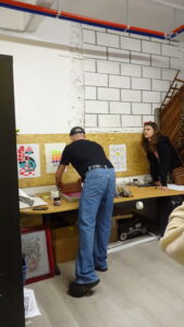 Le pochoir étant prêt, les élèves ont pu imprimer leurs propres affiches après démonstration de l’artiste. Comment imprimer ?