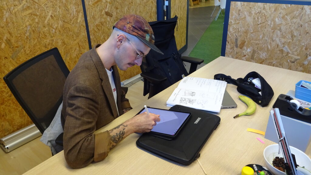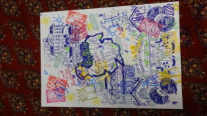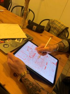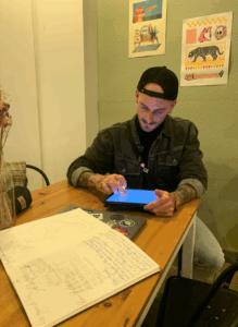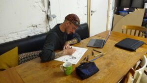 Pour réaliser cette œuvre, l’artiste a utilisé sa tablette avec un programme spécifique lui permettant d’obtenir directement le dessin en format digital. Il l’a ensuite imprimé en format A3 et A4 sur du papier cellophane, c’est ce qu’on appelle un typon. Cette étape était essentielle pour la suite de sa résidence, notamment pour les ateliers de sérigraphie.