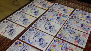 Avec des gouges, les participants ont gravé des motifs originaux sur des gommes. Ensuite, avec des tampons encreurs, ils ont appliqué de la couleur sur les gommes gravées qu’ils ont ensuite tamponnées sur les affiches.