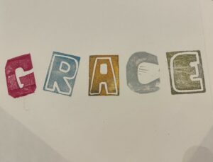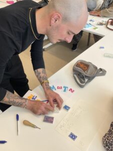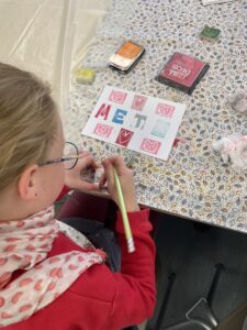 Pas à pas, il a guidé les participantes dans la création de leurs propres tampons : elles ont d’abord dessiné une lettre en miroir sur une gomme, puis creusé la forme à la gouge (un outil à lame courbe et tranchante, utilisé pour creuser ou sculpter la matière comme le bois, le linoléum ou la gomme), avant d’appliquer l’encre en douceur – en pressant le tampon sur l’encreur et non l’inverse, afin de préserver les pigments colorés dans la mousse de l’encreur. Arrive ensuite le moment magique : tamponner la feuille, découvrir son empreinte, jouer avec la répétition, le rythme et la couleur.