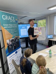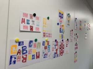 Les enfants, se sont ensuite initiés à la gravure, gouge à la main, pour créer leur propre motif. En fin d’atelier, ils ont accroché leur affiche côte à côte, formant un mur coloré et vivant, reflet de leur enthousiasme collectif. Avant de repartir, chacun a emporté avec lui son tampon et son affiche, souvenirs tangibles d’un moment de partage et de découverte.