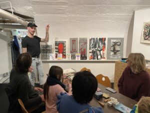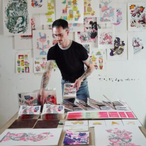 L’artiste avait débuté la rencontre par une présentation de son parcours et de son univers graphique – entre sérigraphie, risographie et illustrations hautes en couleur – avant d’introduire la tampographie.