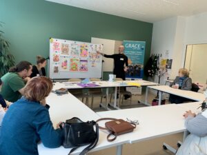 Le 14 octobre, Jo a animé un premier atelier de tampographie avec une dizaine de participantes de l’association Cassis, un groupe de femmes seniors venues découvrir sa démarche artistique et s’initier à cette technique manuelle alliant gravure, dessin et impression.