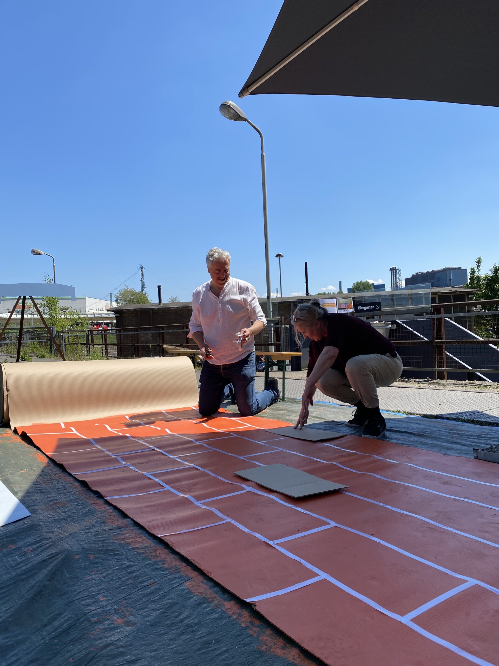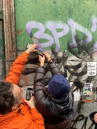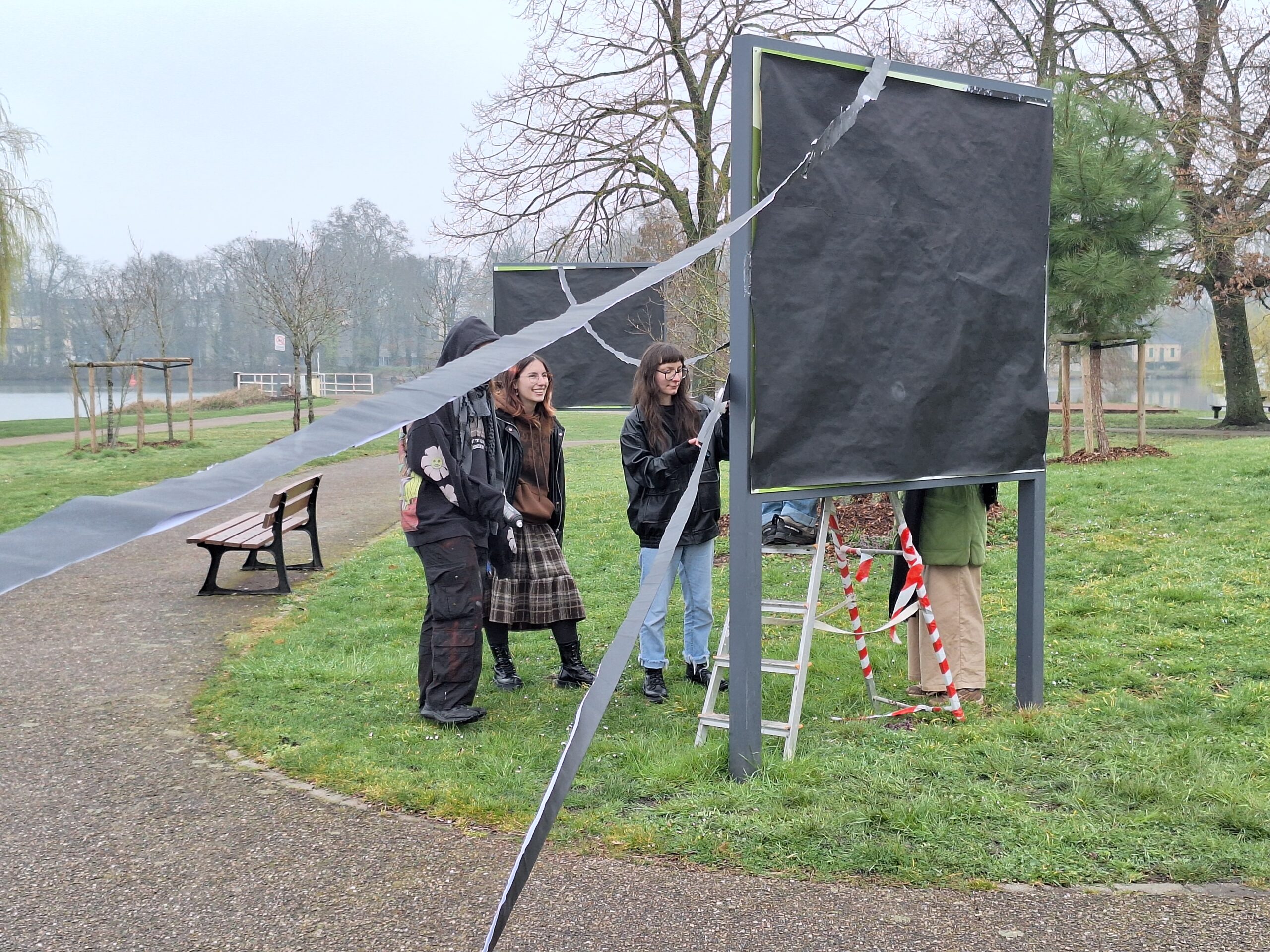 Ein erstes Trio entschied sich, ein großformatiges Werk auf drei Kartonplatten zu erstellen, die sie mit Graffiti-Motiven bemalten. Die Installation fand vor einem leerstehenden Gebäude statt, das ihnen bei der Erkundung besonders aufgefallen war.