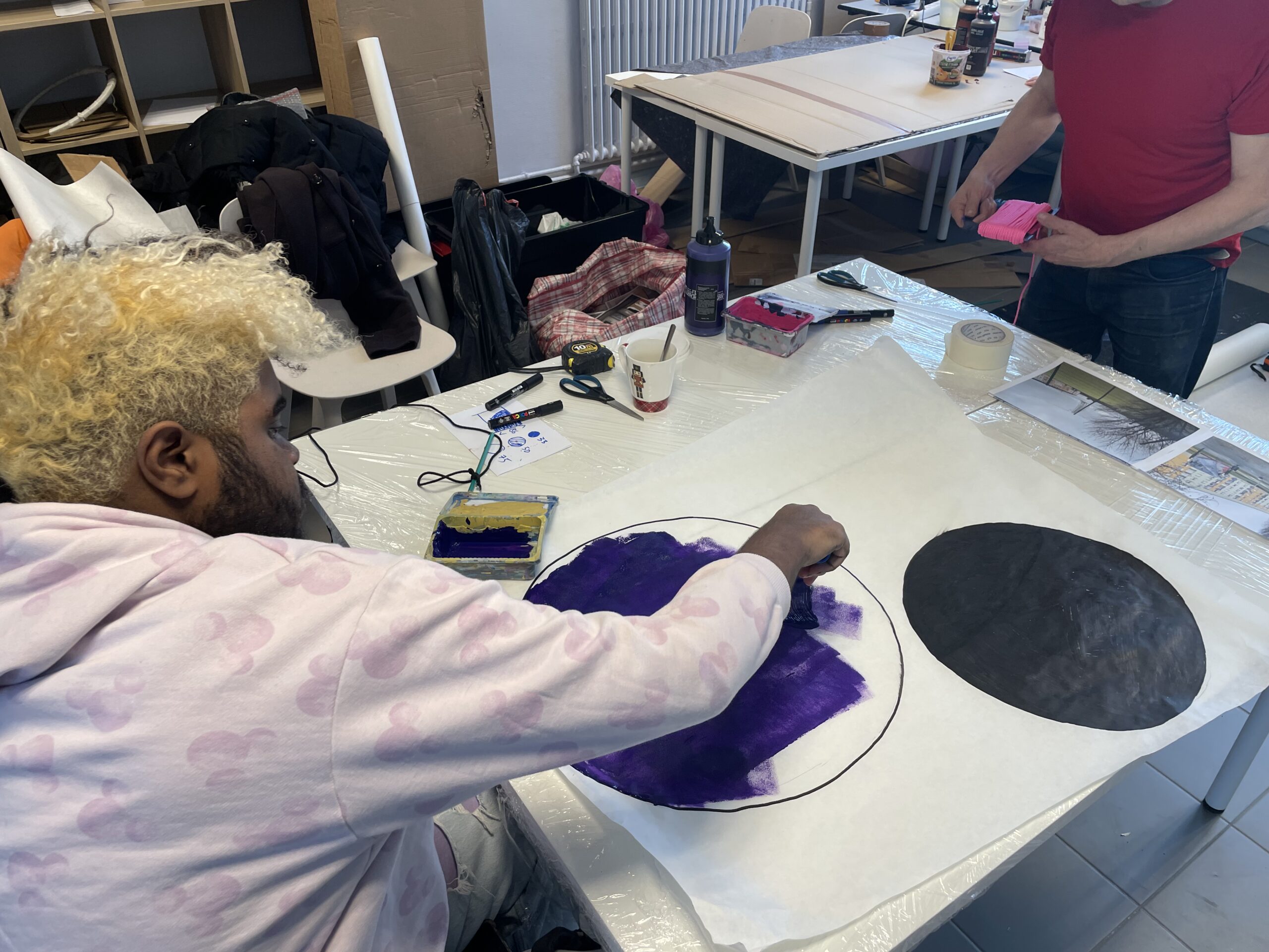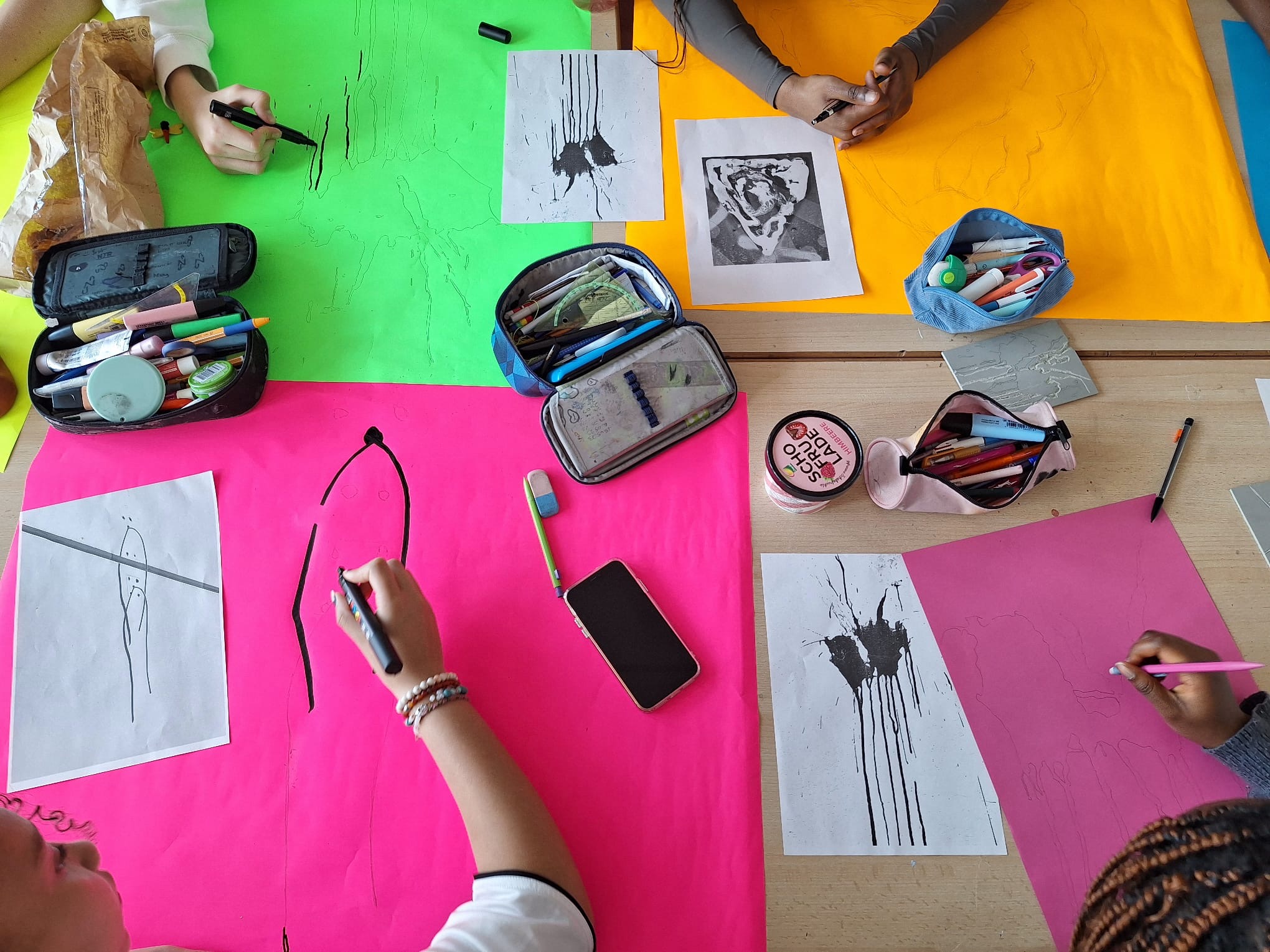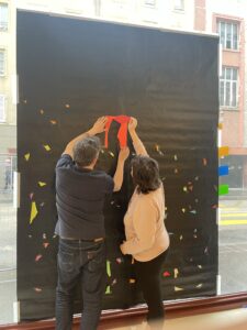 Für die sieben ausgewählten Projekte kamen verschiedene Materialien und Techniken zum Einsatz: bemalter und dekorierter Karton, dickes Papier, Absperrbänder, Sprayfarben und vieles mehr. Den Abschluss des Workshops bildete eine Werkschau in der Galerie der ESAL – ein Moment des Teilens und der Sichtbarkeit für alle Beteiligten.