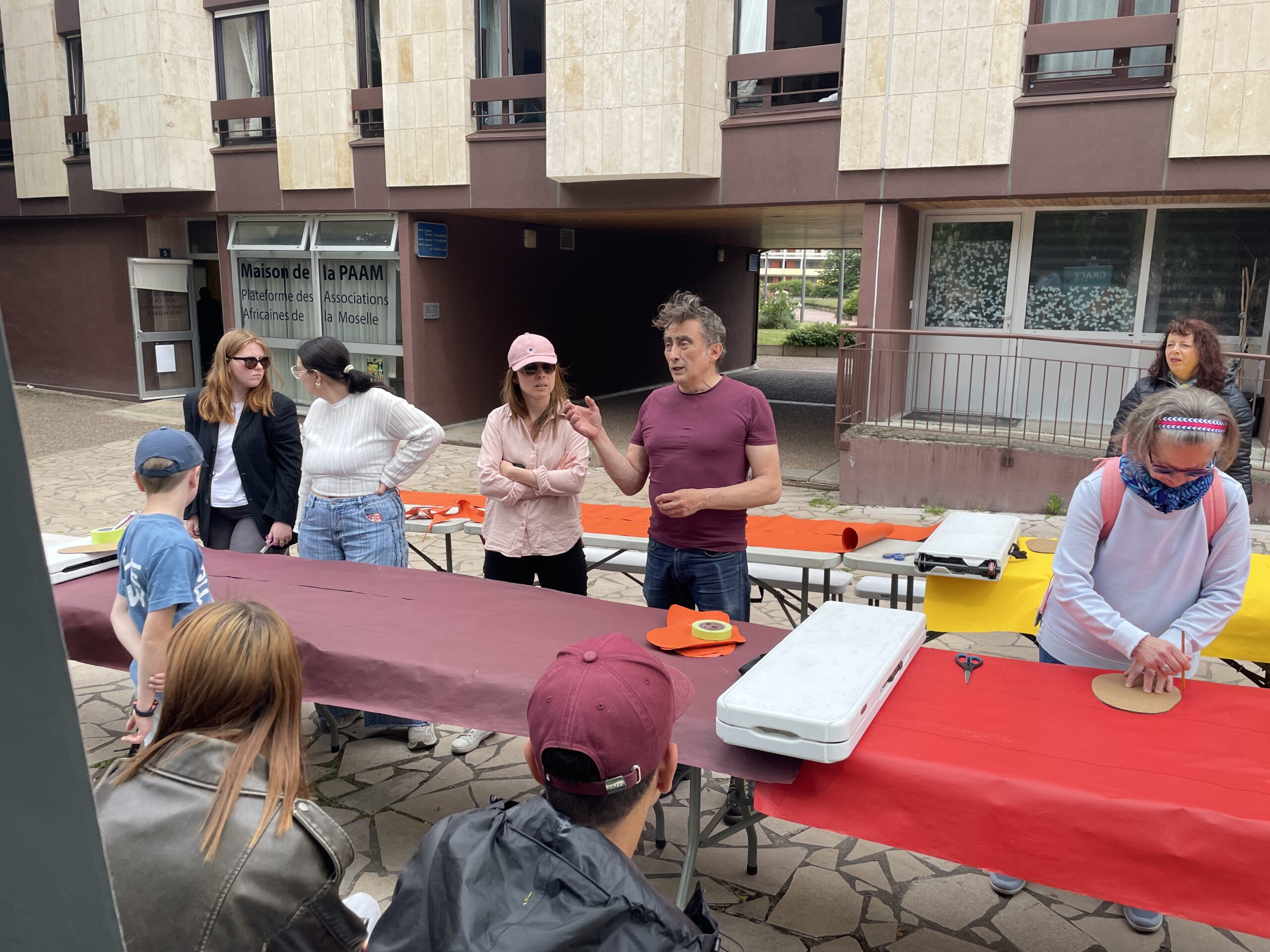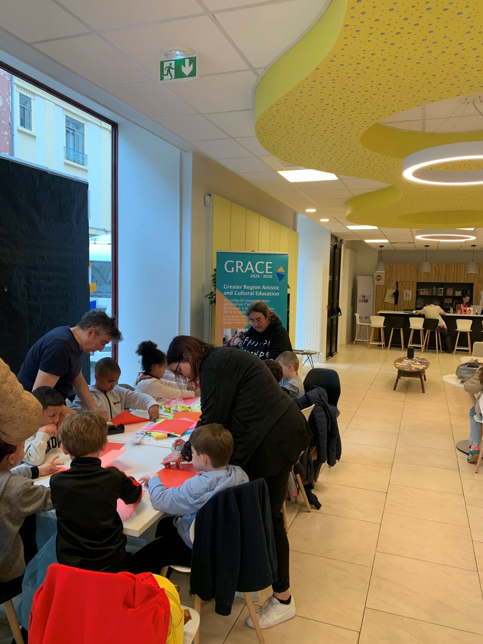 Am Mittwoch, den 23. April, fand im CAP – Maison des étudiants, de la jeunesse et des associations in Metz ein künstlerischer Workshop mit dem Künstler OX statt. Unter dem Titel „Les p'tits papiers – Affichez. Arrachez. Recommencez !" bot der Workshop eine spielerisch-kreative Erfahrung mit vergänglichen Plakaten. Zwei Schaufenster waren mit schwarzen Plakaten vorbereitet, auf die Kinder, Jugendliche und Erwachsene bunte Blätter klebten und wieder abrißen – so entstanden lebendige Spuren auf den Glasflächen. An einer zweiten Station wurden die abgerissenen Stücke zu künstlerischen Collagen verarbeitet. Das gemeinsame, sich entwickelnde, farbenfrohe Werk wurde anschließend von OX im urbanen Raum neu platziert und setzte den künstlerischen Dialog mit der Stadt fort.