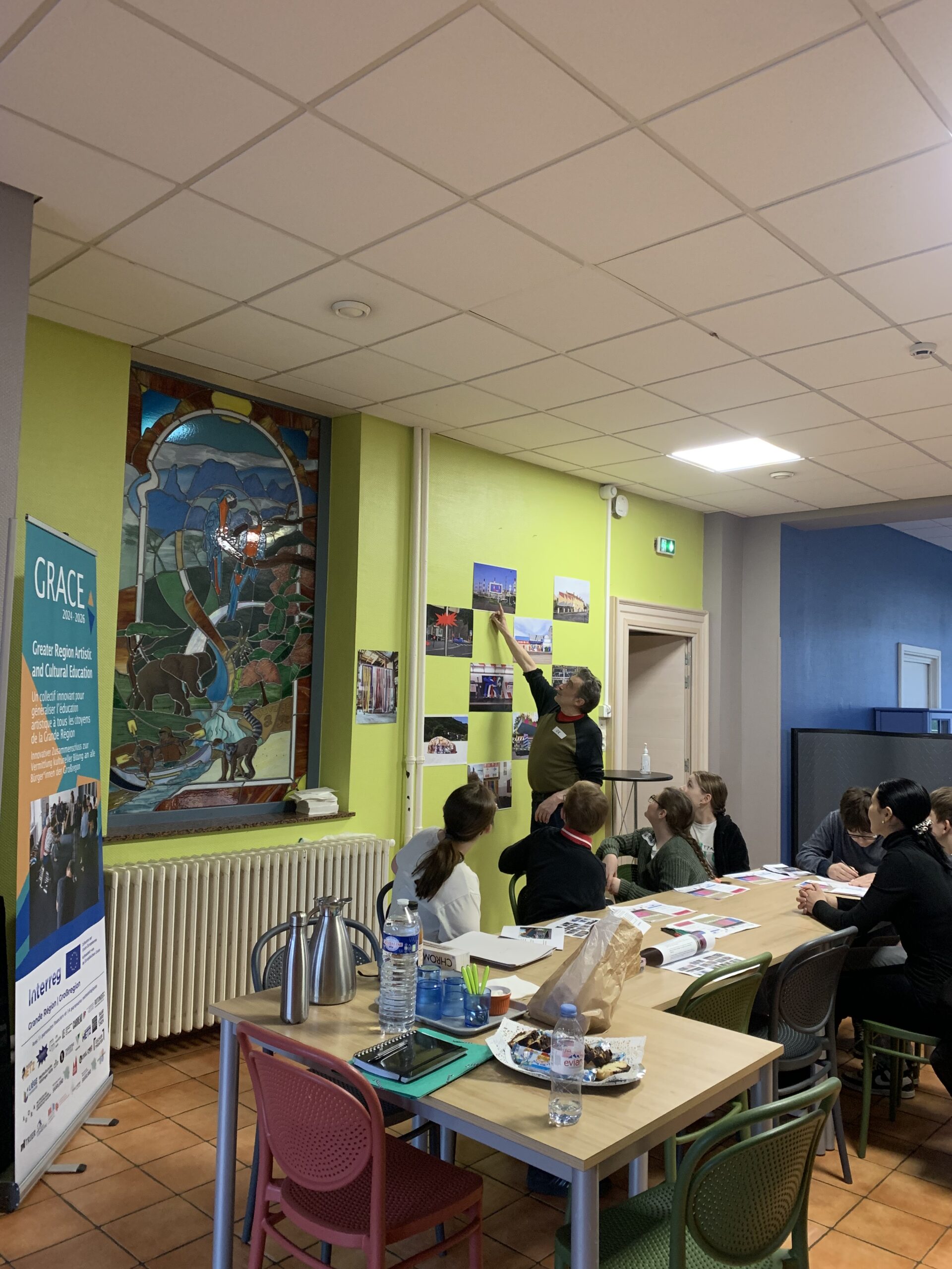 Am 12. März fand ein Workshop in der Residenz Haute-Seille mit Mitgliedern des Seniorenrats und Bewohnerinnen und Bewohnern der Einrichtung statt. Nach einem gemütlichen Einstieg mit Kaffee und einer Diashow zu früheren kulturellen Ausflügen – etwa zur Völklinger Hütte oder ins Zentrum von Saarbrücken – stellte OX seinen künstlerischen Ansatz vor.