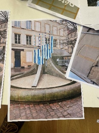 Ein weiteres Team gestaltete eine Skulptur für den Brunnen auf dem Place des Charrons. Inspiriert von den Blau- und Grautönen der umliegenden Tore und Gitter übertrugen sie diese Farbnuancen in ihre Komposition aus Karton und Styropor, die die Bewegung von Wasserstrahlen und Tropfen nachahmte.
