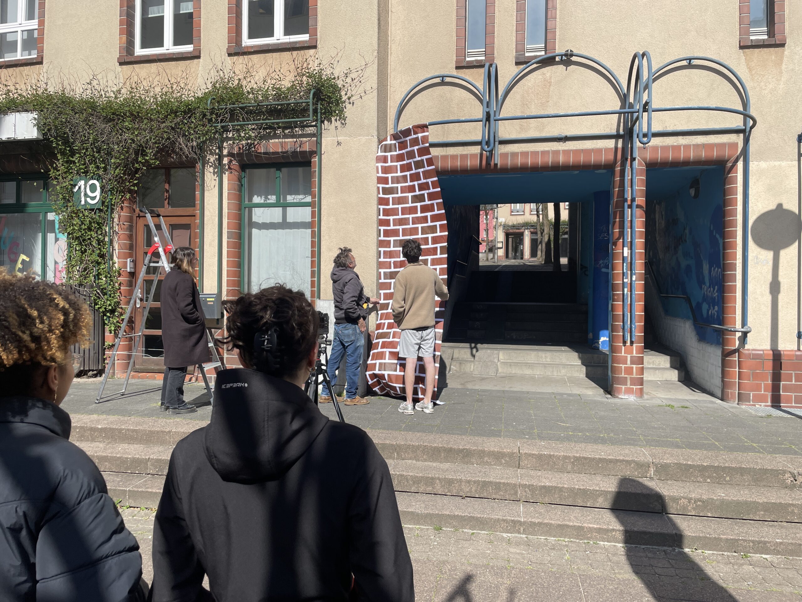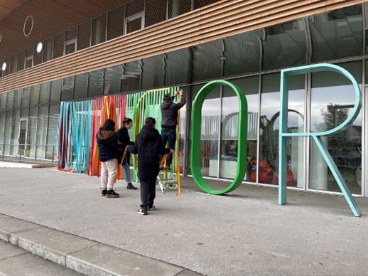 Am 20. Februar installierten die Jugendlichen schließlich ihre Werke im Stadtraum. Dabei kamen auch Techniken wie Stop-Motion und optische Täuschungen zum Einsatz. Die erste Gruppe widmete sich dem Werk „Das unförmige Ei" – eine Szene mit gelben Eiformen aus Karton und Papier (Zylinder, Pyramide, Würfel), die scheinbar langsam über den Boden zu fließen begannen. Die zweite Gruppe gestaltete große, bunte Würfel, in die sie selbst hineinschlüpften, um durch das Bewegen der Kartons ein Stop-Motion-Video zu kreieren. Ein weiteres Duo erschuf den „magischen Baum", eine illusionistische Wandarbeit aus bemaltem Tapetenpapier, in der ein Baum scheinbar hinter der Mauer der Fondation Saint-Jean hervorsprießt und sich visuell mit einer Straßenlaterne vereint.
