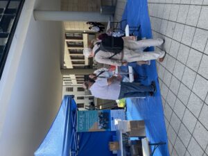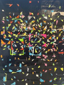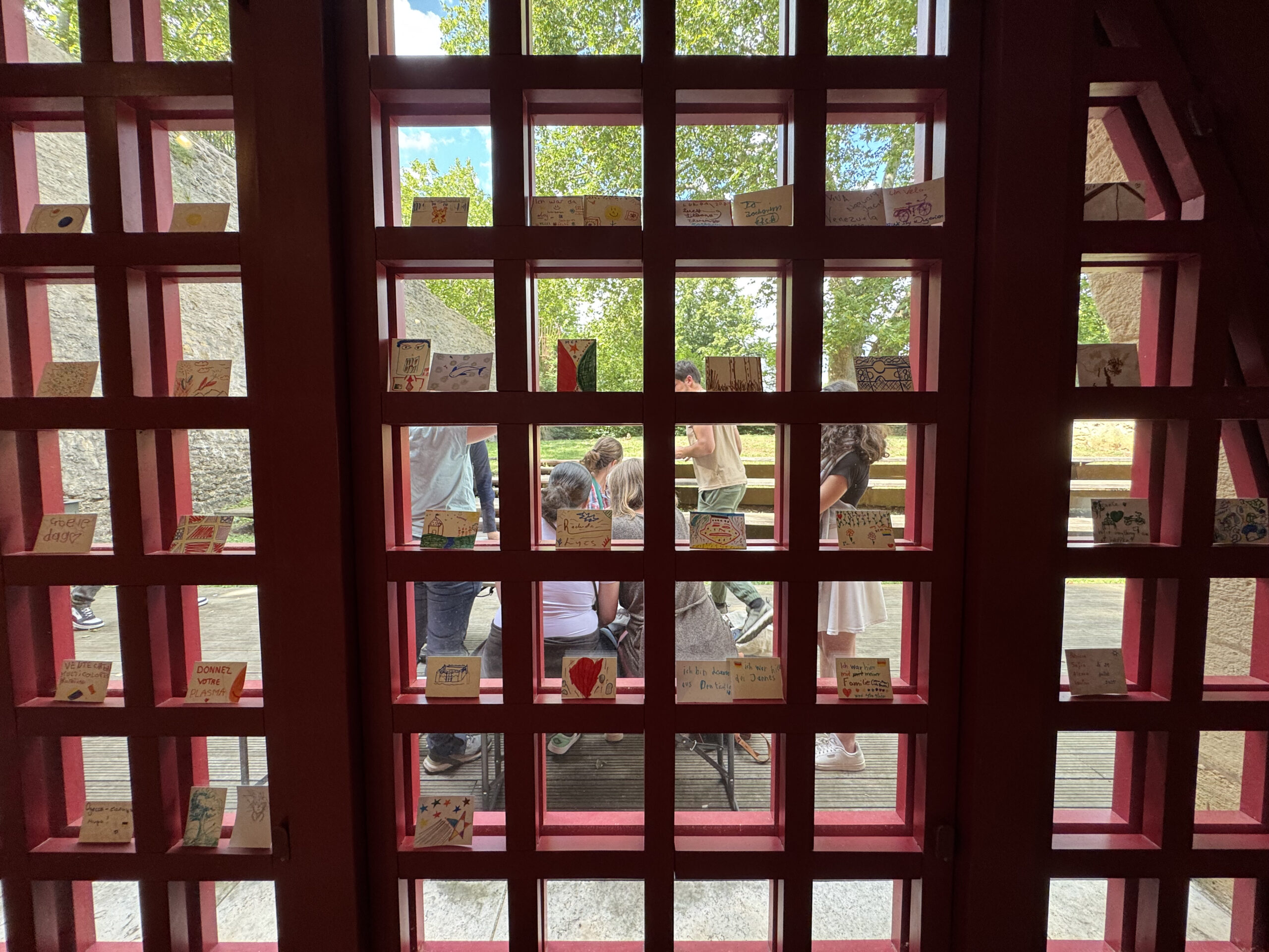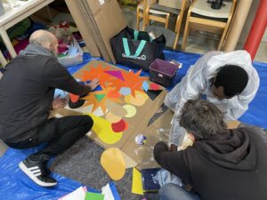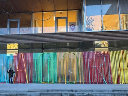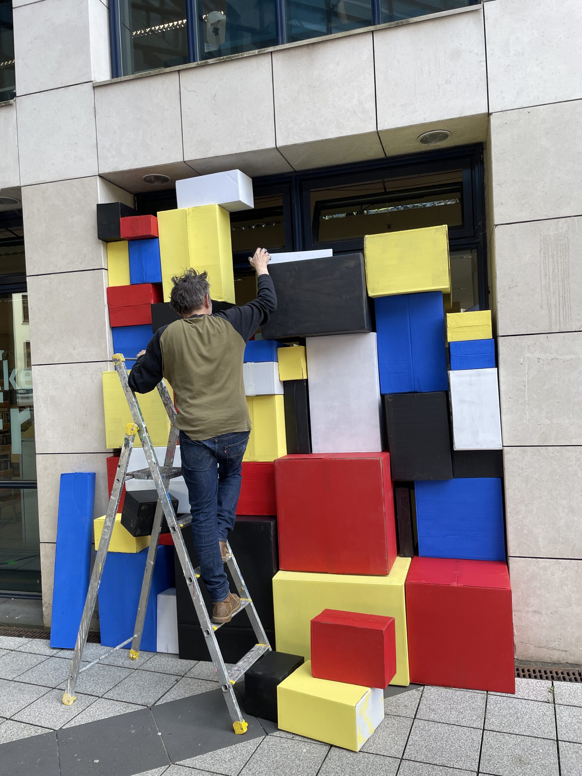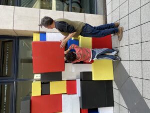 Am 16. Mai empfing die Stadtbibliothek Saarbrücken OX zu einem offenen, partizipativen Workshop für die Bewohner:innen. Das Konzept war einfach, aber bedeutsam: Aus verschieden großen Kartons in den Farben der französischen und deutschen Flagge – Blau, Weiß, Rot, Schwarz und Gelb – entstand eine temporäre künstlerische Installation, die vor den Fensterflächen der Bibliothek als Mosaik angeordnet wurde. Insgesamt nahmen etwa zwanzig Personen teil, hinterließen ihre Spuren und schufen Stück für Stück ein lebendiges Symbol der deutsch‑französischen Kooperation durch Kunst.