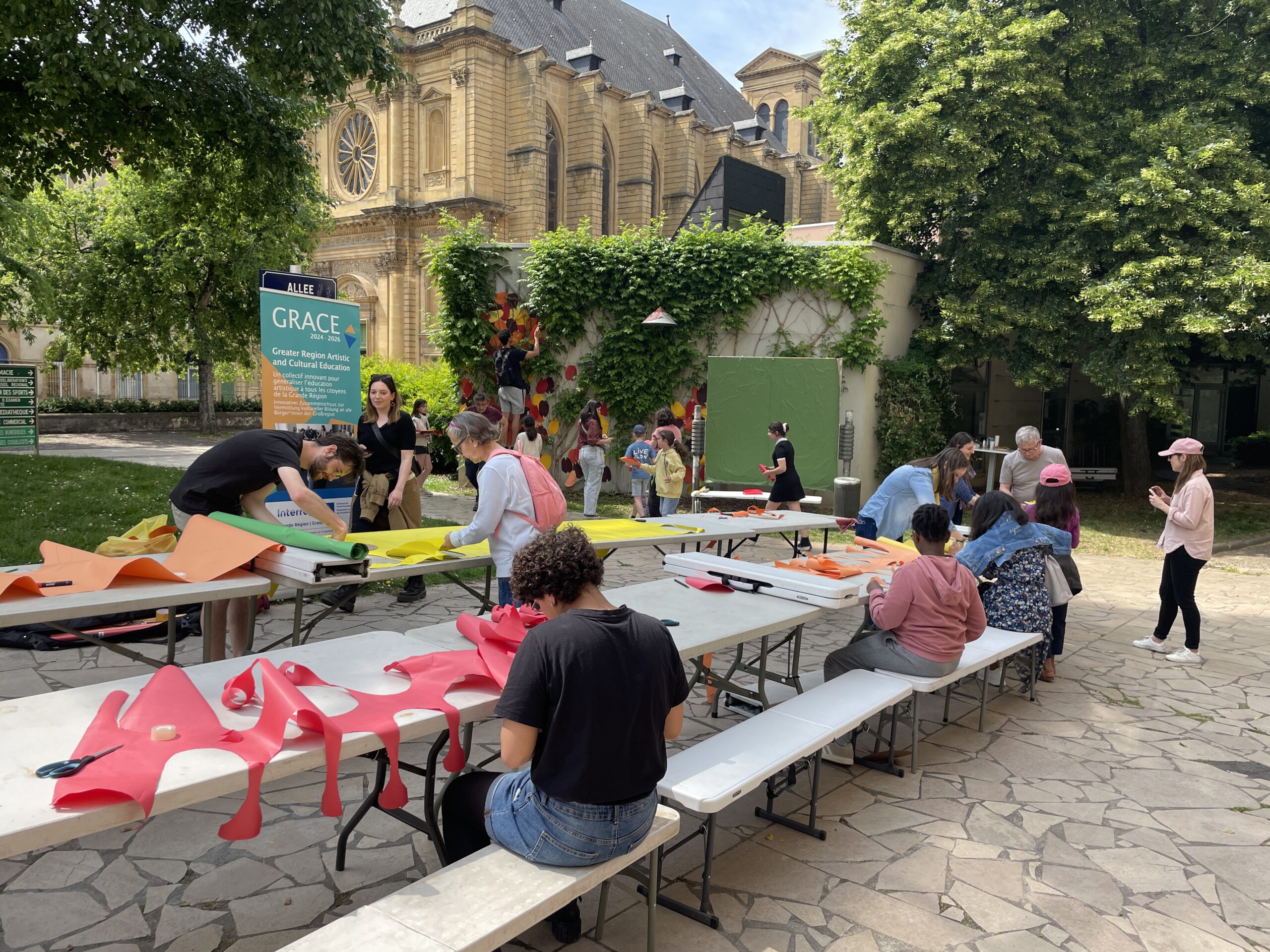 Am Mittwoch, den 21. Mai 2025, fand vor der Médiathèque Verlaine der Workshop „Gommettes Géantes" statt. Unter der Leitung von OX gestalteten die Teilnehmenden ein Gemeinschaftskunstwerk aus buntem Tapetenpapier, aus dem herbstblattähnliche Formen ausgeschnitten und an einer begrünten Wand angebracht wurden. Die Installation, genannt „Chansons d'automne" in Anlehnung an ein bekanntes Gedicht von Verlaine, wurde durch Girlanden aus Papierresten ergänzt und erhielt so eine festliche, lebendige Note. Etwa 60 Personen – darunter Jugendliche der Zweiten‑Chance‑Schule, Kinder aus sozialen Zentren und viele Anwohner:innen – wirkten an dem Werk mit.