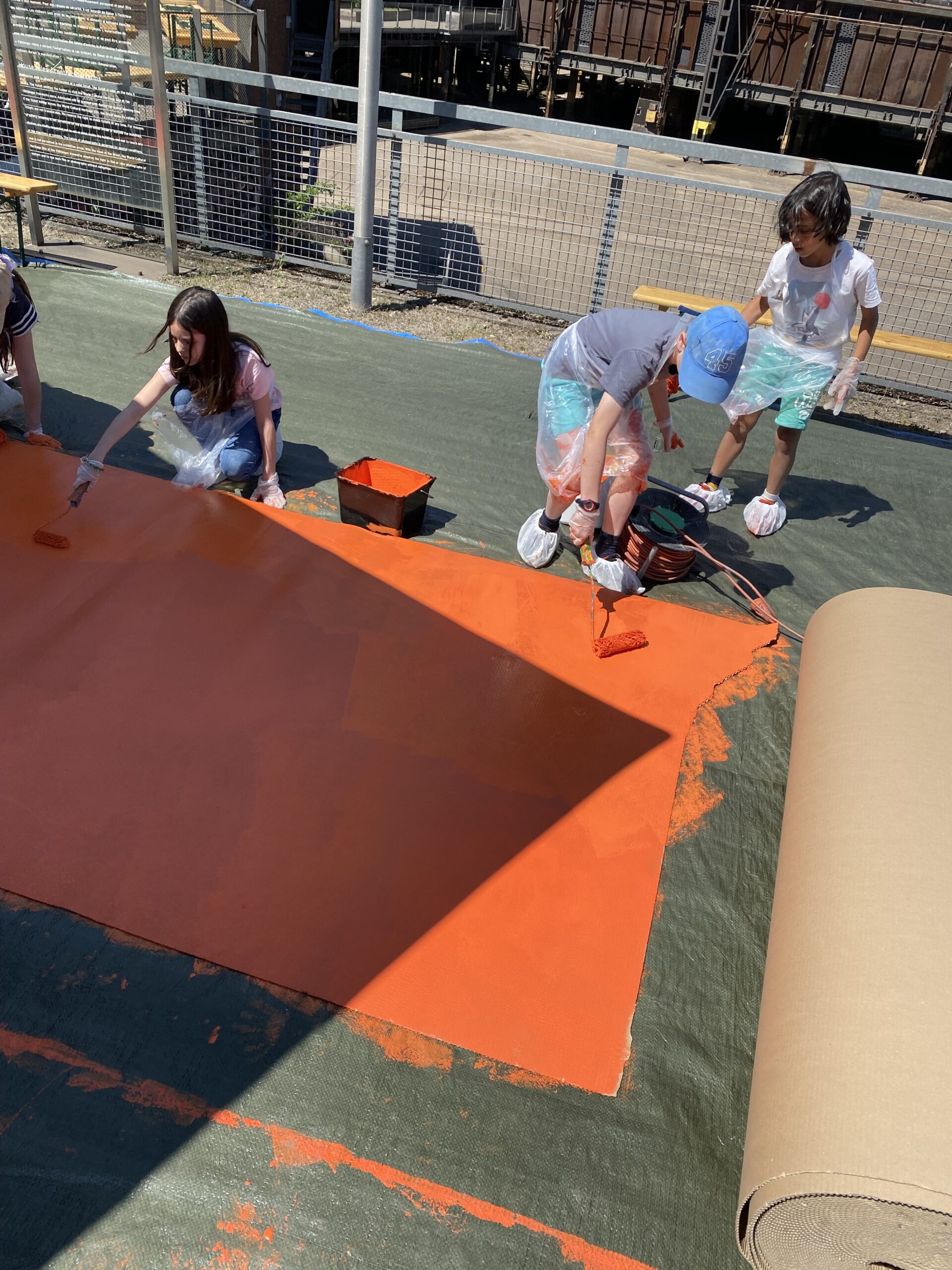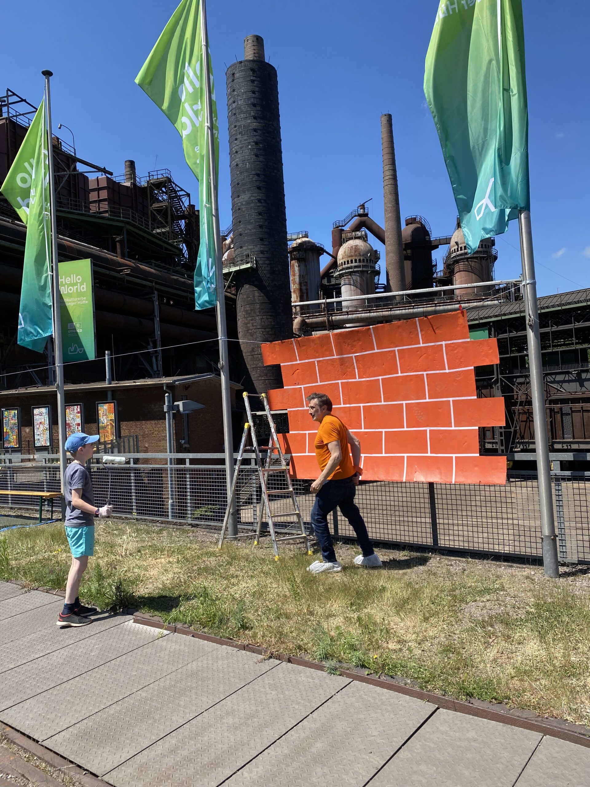 Zum Internationalen Museumstag organisierte die Völklinger Hütte einen Workshop, in dem die Teilnehmenden mit OX gemeinsam ein Trompe-l'œil realisierten, das falsche Ziegelsteine in das industrielle Ambiente der Stätte einfügte. Rund dreißig Personen, Erwachsene und Kinder, folgten OX' Anleitung: Sie bemalten Papprollen in leuchtendem Orange, zogen Ziegelkonturen vor, klebten zum Schluss weiße Klebebänder als Fugen — und hängten das Gemeinschaftswerk anschließend auf, um mit der Architektur des Ortes zu kommunizieren.