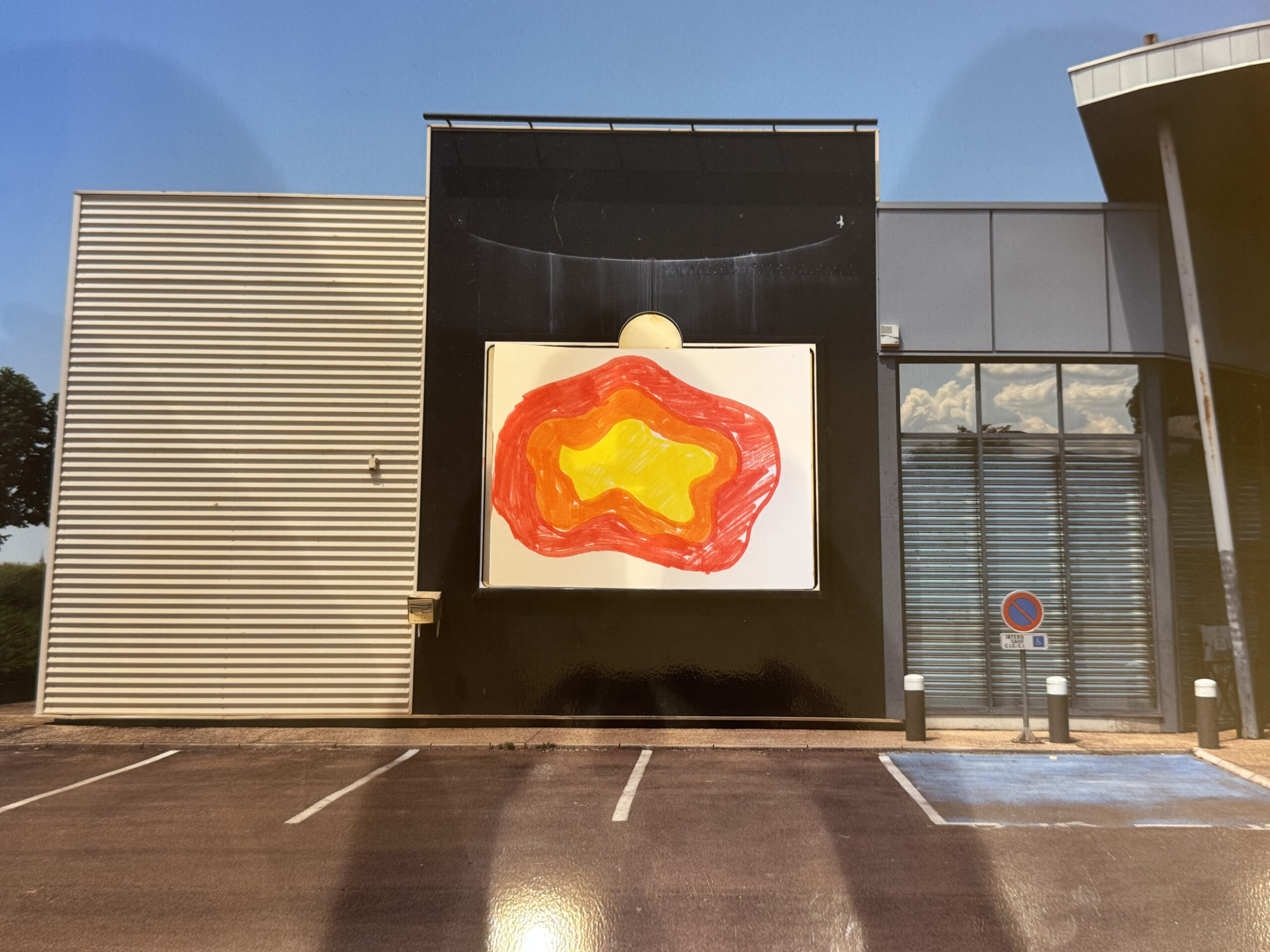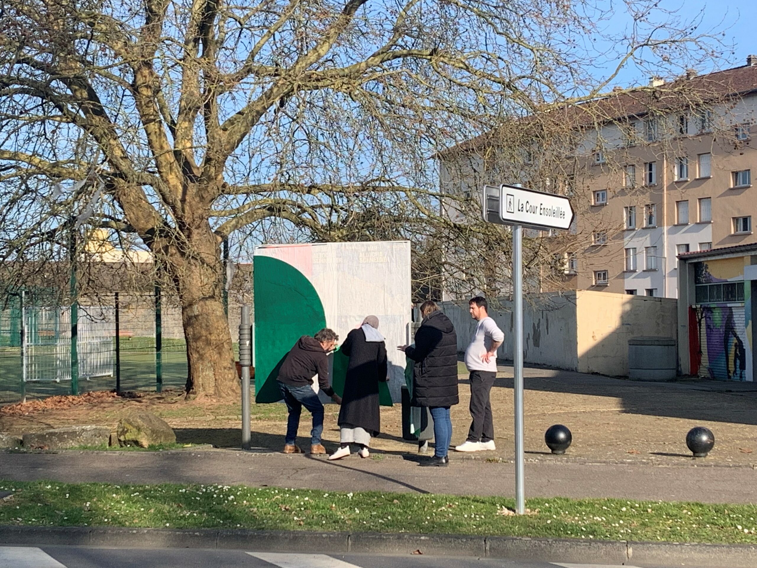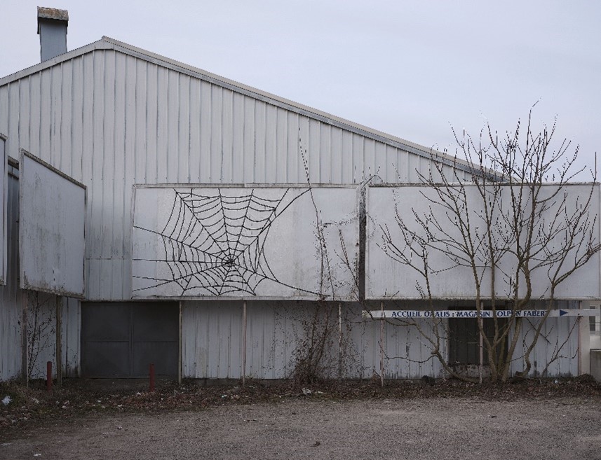 Noch vor Beginn des Workshops im Sozialzentrum Lacour im Stadtteil La Patrotte-Metz Nord unternahm OX eine erste Erkundung des Geländes. Dabei stieß er auf einen zugewachsenen, ungenutzten Werbeträger auf dem Parkplatz eines Supermarktes. Inspiriert von diesem vernachlässigten Objekt erschuf er ein filigranes Spinnennetz aus Papier – ein poetisches Echo der kahlen Äste des benachbarten Baums.