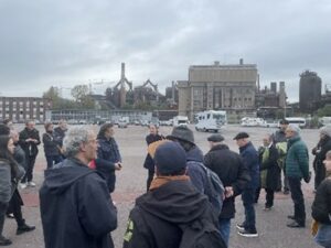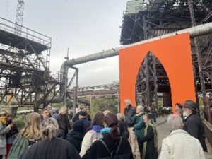 Begleitet wurden sie von Frank Kramer, dem Kurator der Veranstaltung, sowie dem Street-Art-Künstler OX. Gemeinsam erkundeten die Besucher das ehemalige Hüttenwerk und entdeckten zahlreiche Kunstwerke, darunter auch die Installation Obus gothique des französischen Künstlers OX. Obus gothique, vor Ort geschaffen, ist ein Bogen, der den Blick auf das Innere der Schwerindustrie in dieser ehemaligen Hütte freigibt – ein Ort mit den Ausmaßen einer Kathedrale oder eines Palastes. Doch diese typische Form der sakralen Architektur verweist, wenn man die Rolle der Völklinger Hütte in den beiden Weltkriegen bedenkt, auch auf das Erscheinungsbild einer Kriegswaffe.