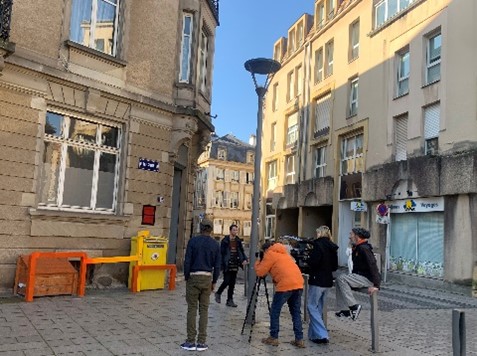 In Kleingruppen ging es anschließend auf Entdeckungstour rund um den Place Coislin und den Place Saint-Louis. Daraus entstanden mehrere Werke: eine orangefarbene Tapetenkomposition, animiert per Stop Motion, die auf einem Ticketautomaten eines Parkhauses „zum Leben" erweckt wurde; eine Installation aus scheinbar herabfallenden Keramikstücken auf einem Stromkasten; sowie eine farbige Hängeskulptur aus Wollfäden, die sich in das darunterliegende Geäst einfügt – feinsinnige Werke, subtil und mit viel Liebe zum Detail umgesetzt.