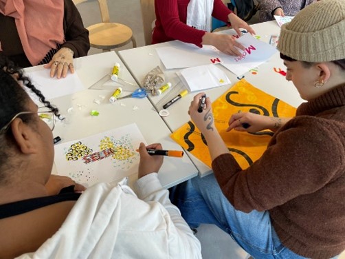 Parallel dazu fand ein weiterer Workshop im Innenraum statt: Dort wurden Fotos anderer Werke von OX gezeigt und den Teilnehmenden standen Papier, Sticker, Filzstifte, Scheren und Kleber zur Verfügung. So konnten sie den kreativen Prozess von OX selbst nachempfinden – indem sie mit Buchstaben spielten oder sie auf ihre eigene Weise tarnen konnten.