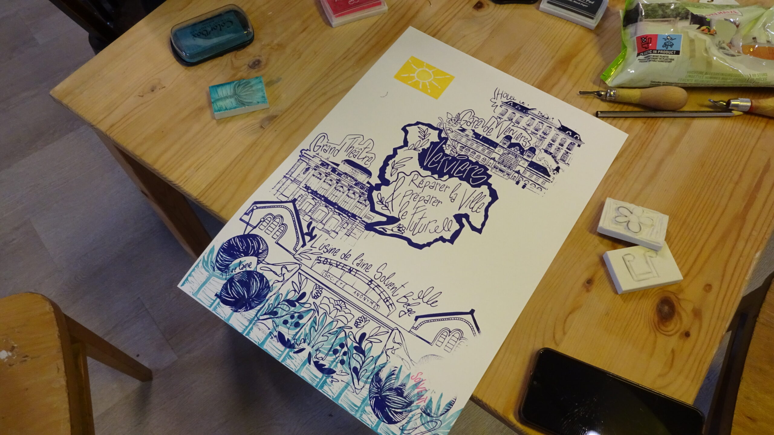 Auf dieser historischen und städtischen Grundlage entstand eine erste Illustration. In der Mitte zeigt sie die Karte von Grand Verviers, umgeben von diesen markanten Gebäuden. Ergänzt wird die Illustration durch Wollknäuel, die an die industrielle Vergangenheit erinnern, sowie durch Blumenmotive, die das Thema „Wiedergeburt” aufgreifen.