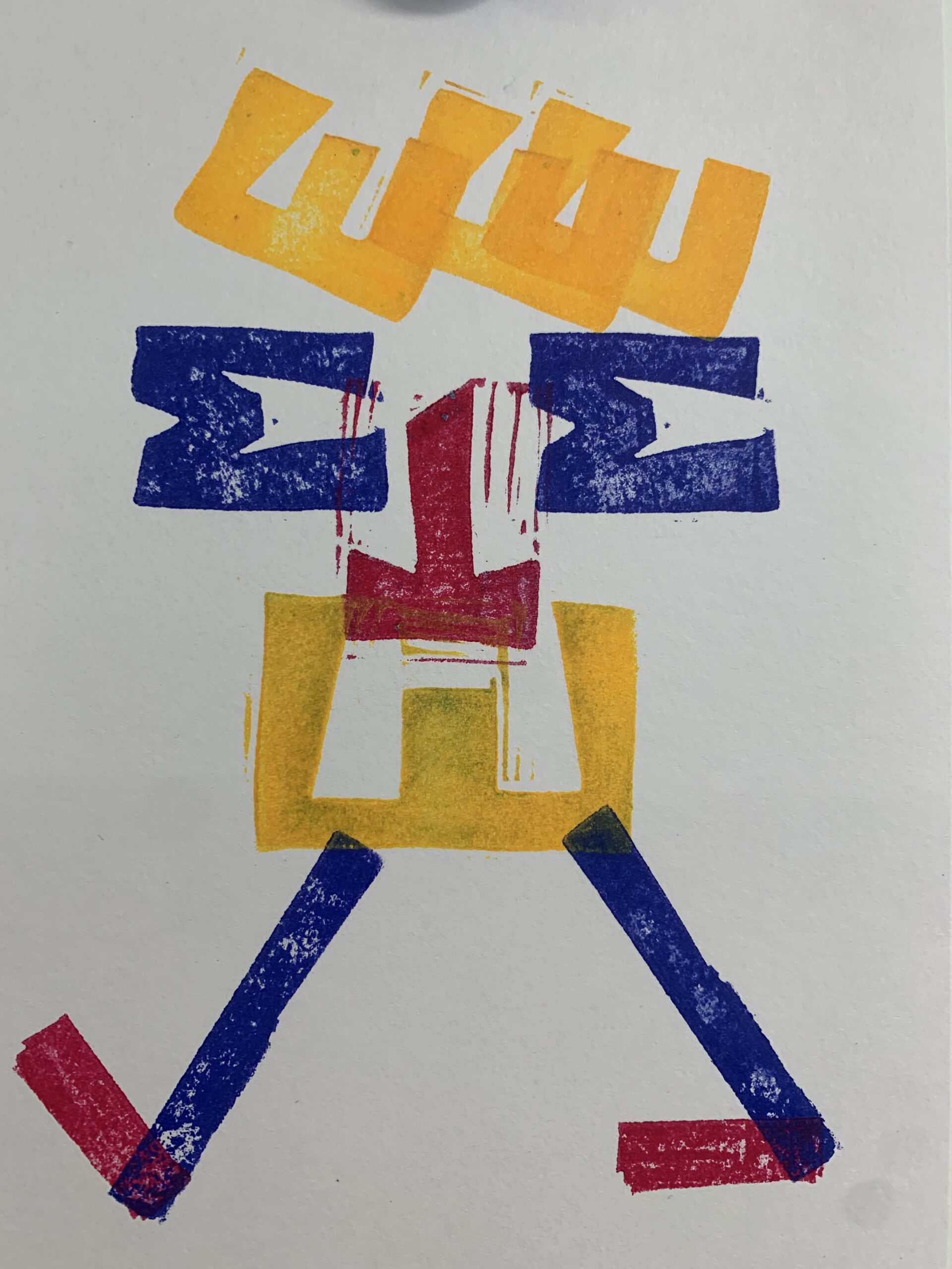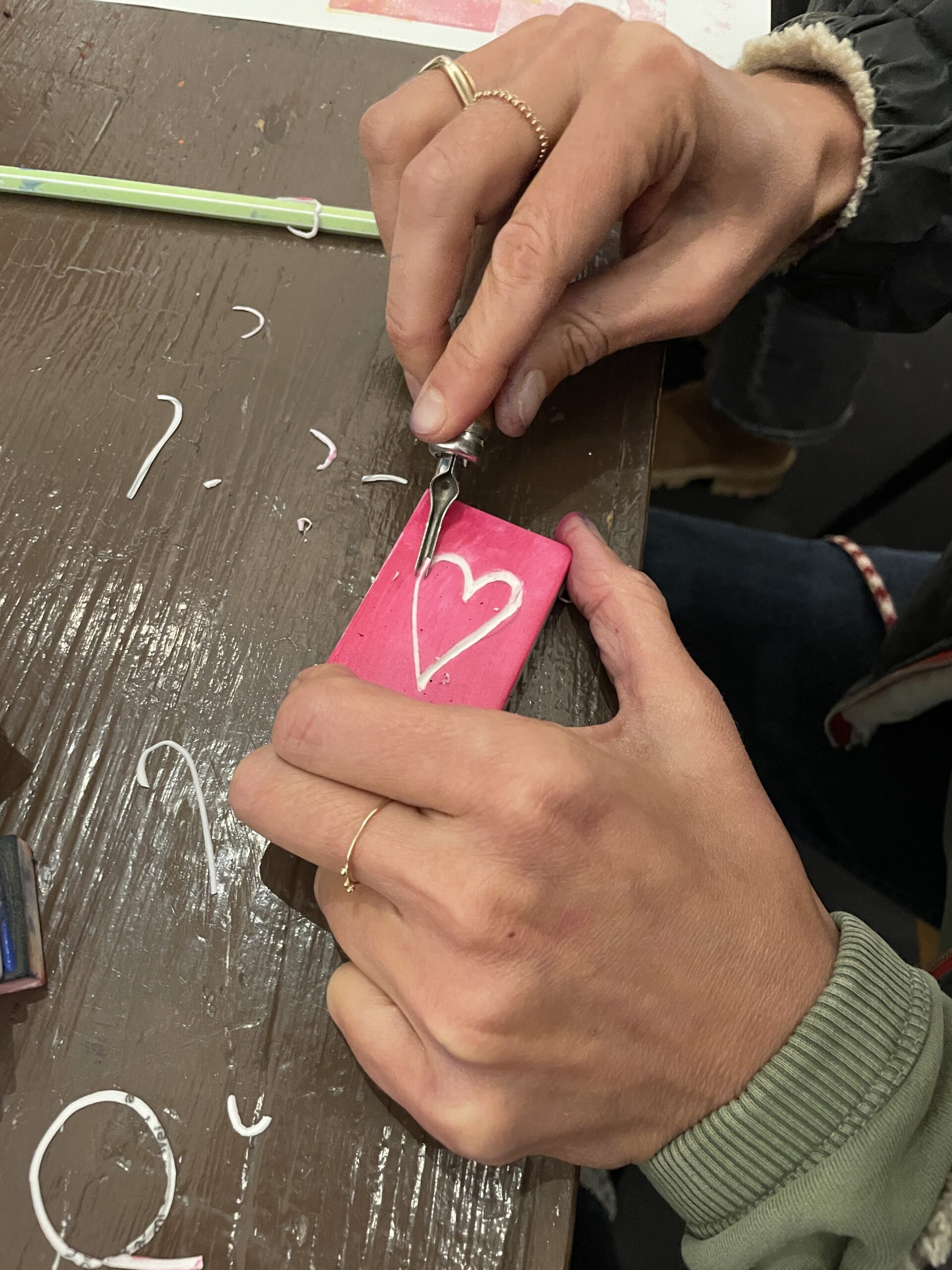 Schritt für Schritt leitete er die Teilnehmerinnen bei der Herstellung ihrer eigenen Tampons an: Zunächst zeichneten sie einen Buchstaben spiegelverkehrt auf ein Gummimaterial und höhlten dann die Form mit einem Hohleisen (einem Werkzeug mit einer gebogenen, scharfen Klinge, das zum Aushöhlen oder Schnitzen von Materialien wie Holz, Linoleum oder Gummi verwendet wird) aus, bevor sie die Farbe vorsichtig auftrugen – indem sie den Tampon auf das Klischee drückten und nicht umgekehrt, um die Farbpigmente auf dem Klischee zu schonen. Dann kam der magische Moment: das Aufbringen des Tampons, das Druckbild auf dem Druckgut entdecken, und das Experimentieren mit Wiederholungen, Rhythmus und Farbe.
