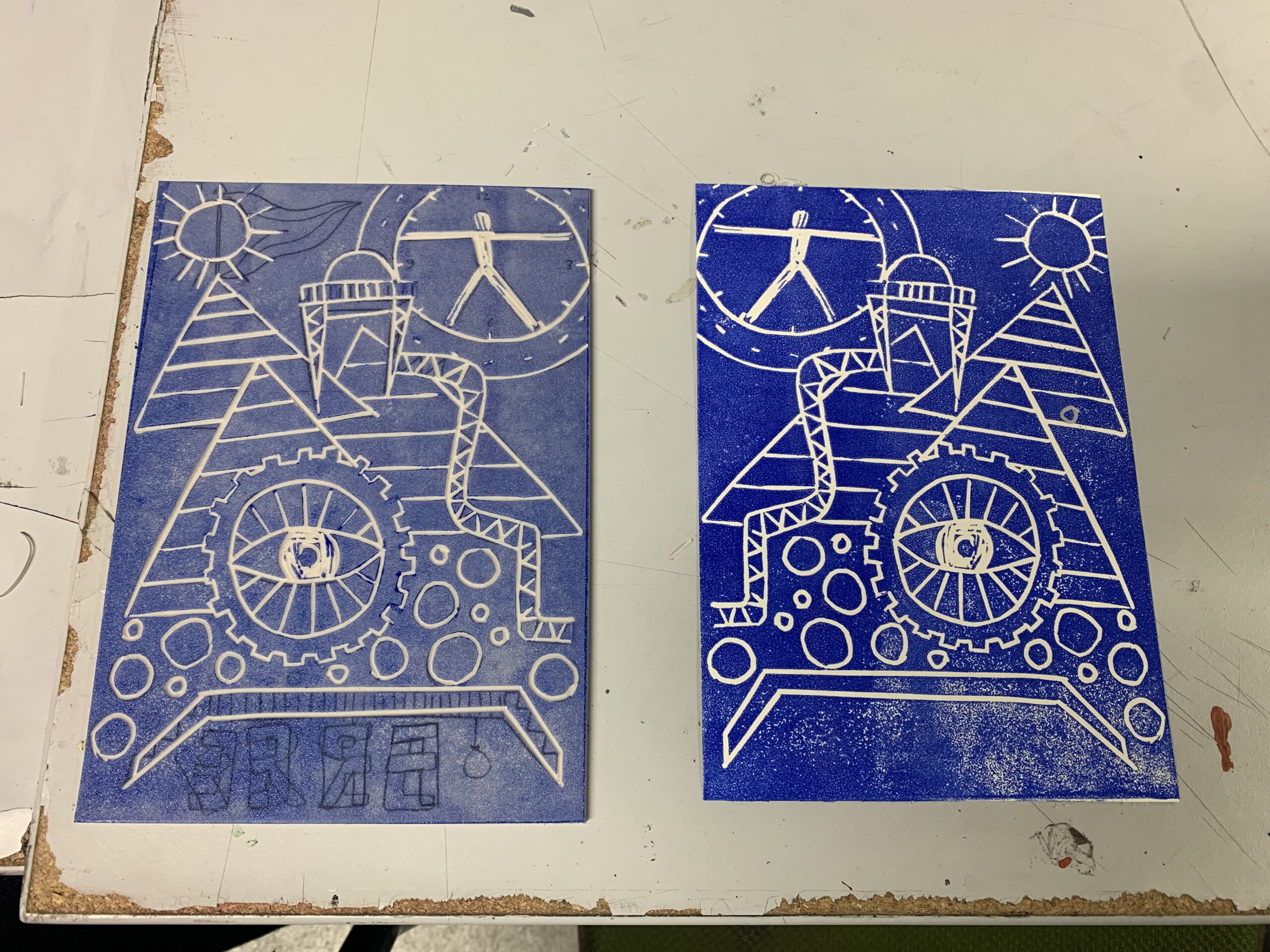 Nachdem die Zeichnung fertig war, ging’s mit dem Gravieren los. Mit dem Hohleisen haben die Teilnehmenden das Material bearbeitet und wahre Kunstwerke geschaffen. Diese langsamen und präzisen Bewegungen erinnerten symbolisch an die Handgriffe, die früher in der Eisenhütte ausgeführt wurden. Viele haben eine wichtige Besonderheit des Linolschnitts entdeckt: Der fertige Druck sieht genau wie die Originalzeichnung aus, nur spiegelverkehrt. Einige Buchstaben, Motive und Kompositionen mussten also verkehrt herum entworfen werden, damit der Druck in der richtigen Richtung lesbar war. Dieser Spiegeleffekt wurde schnell zu einem grafischen Spiel. Die Teenager unter den Teilnehmenden hatten Spaß daran, asymmetrische Elemente und Formen zu entwerfen, die erst nach dem Drucken wirklich Sinn ergaben. Für Jo ist „der Spiegeleffekt Teil der Poesie der Gravur: Man arbeitet in eine Richtung, und das Bild erzählt in die andere Richtung.
