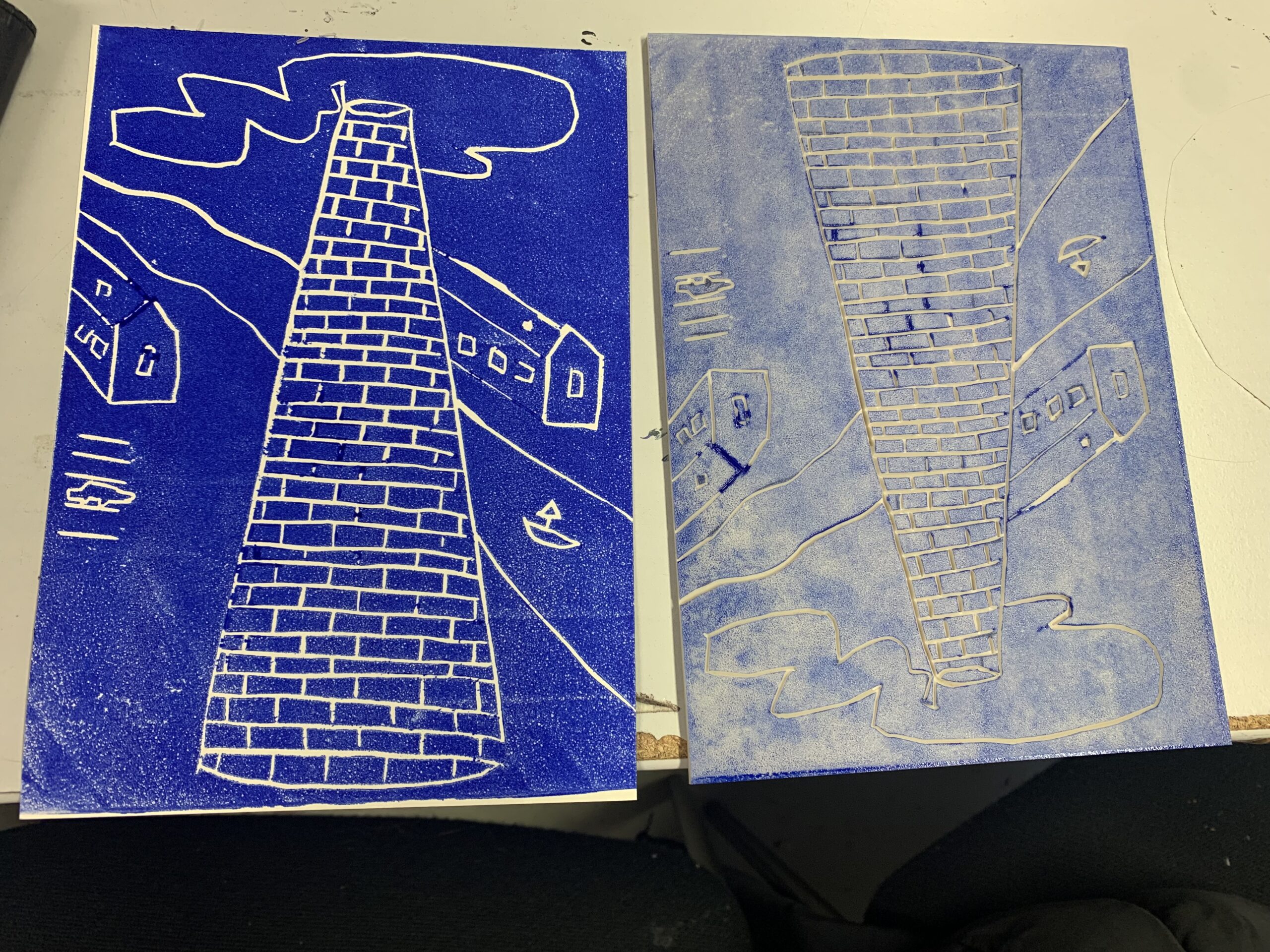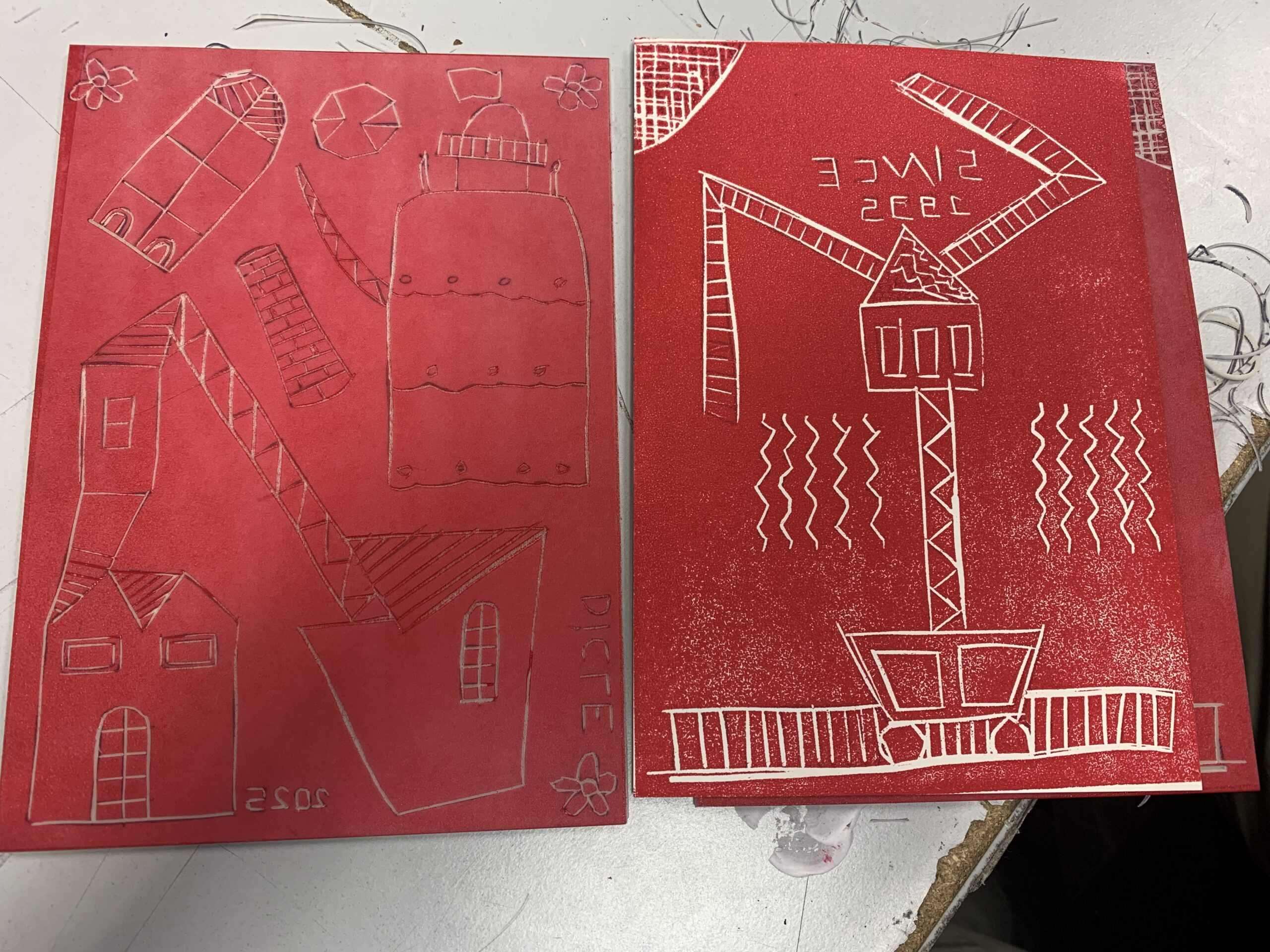 In diesem Setting hat Jo sich für Soft Cut entschieden, ein Material, das fast wie dichter Gummi ist und flexibler als normales Linoleum. Dieses Material lässt sich noch flüssiger gravieren, sodass wirklich jeder – egal ob Kinder, Jugendliche oder Erwachsene – die für die Gravur erforderlichen klaren Linien erzielen kann. Jo hat auf jede Platte einen Sockel gemalt, der von der Architektur des Ortes inspiriert ist: Silhouetten von Schornsteinen, vertikale Flächen, stilisierte Rohrleitungen, eckige Formen. Dieser Ausgangspunkt war der grafische Impuls. „Ich gebe nur einen Tipp: Die Idee besteht darin, dass jeder die Hütte auf seine eigene Art weiterführen kann. “