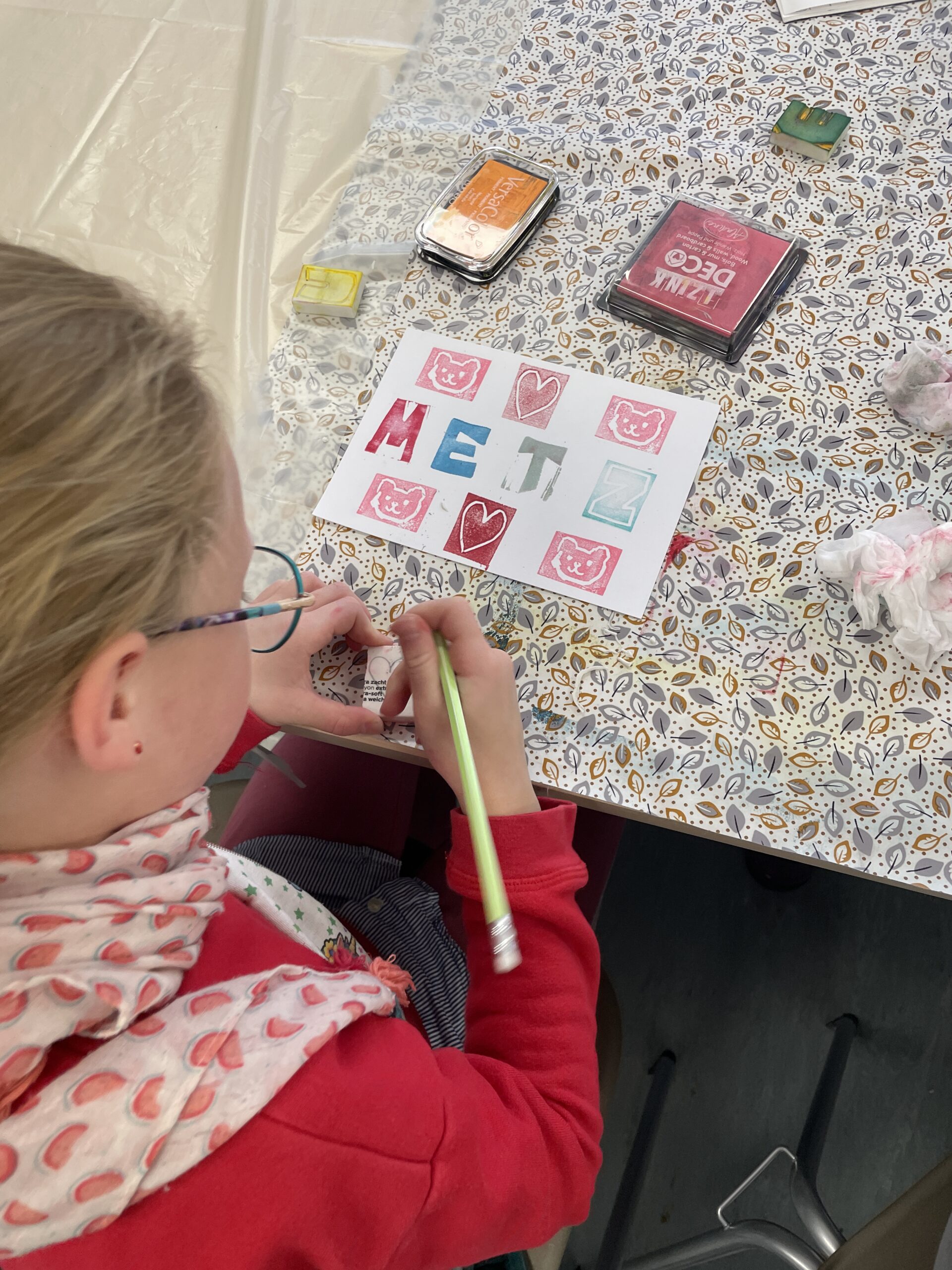 Am 15. Oktober führte Jo einen Workshop für Eltern und Kinder durch, der ganz im Zeichen des Spielens und des Austauschs stand. Für diesen Workshop hatte er ein ganzes Alphabet an Tampons vorbereitet, damit die Jüngsten sich mit den Tampons vertraut machen und ihre Lieblingswörter und -motive direkt drucken konnten.