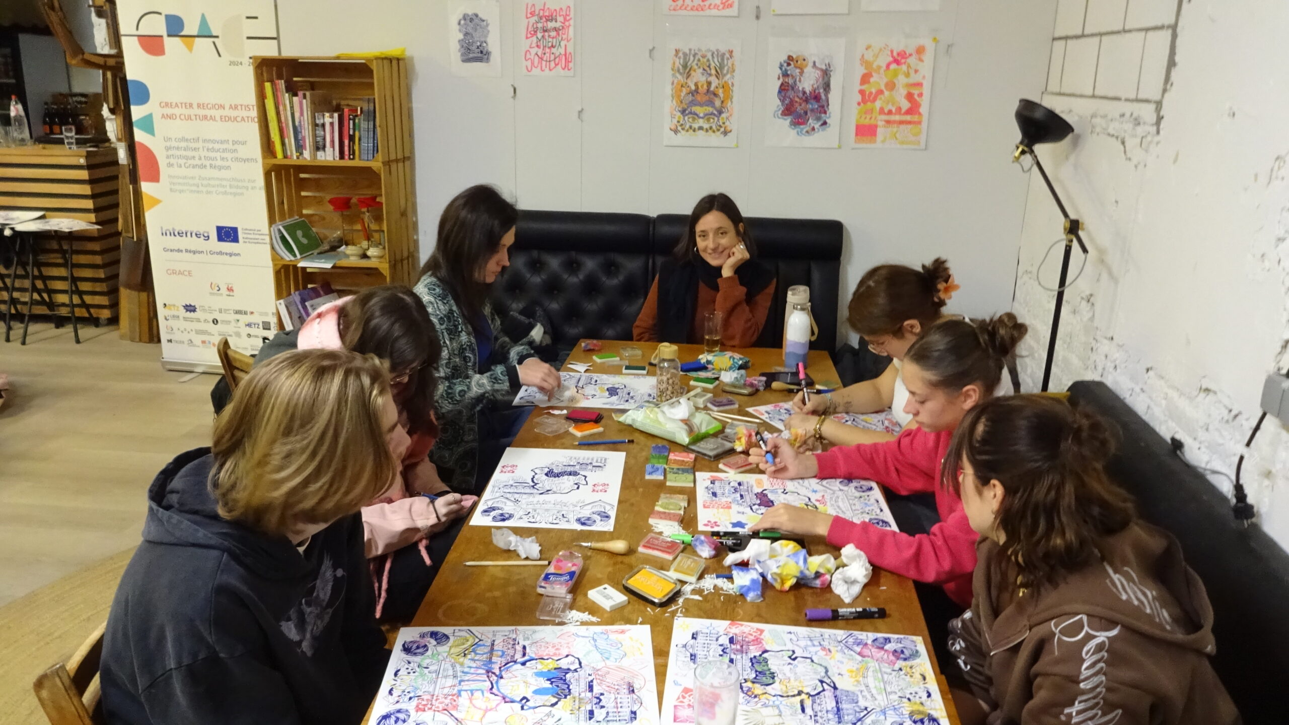 Auf dem Tisch reihten sich die Buchstaben aneinander, die Farben breiteten sich aus, die Papiere wurden mit fröhlichen Formen bedeckt, die an das Kulturerbe und die Stadt Metz erinnerten: Namen von Stadtvierteln, der Bahnhof von Metz oder einfach nur hübsche Symbole und die Vornamen der Teilnehmenden.