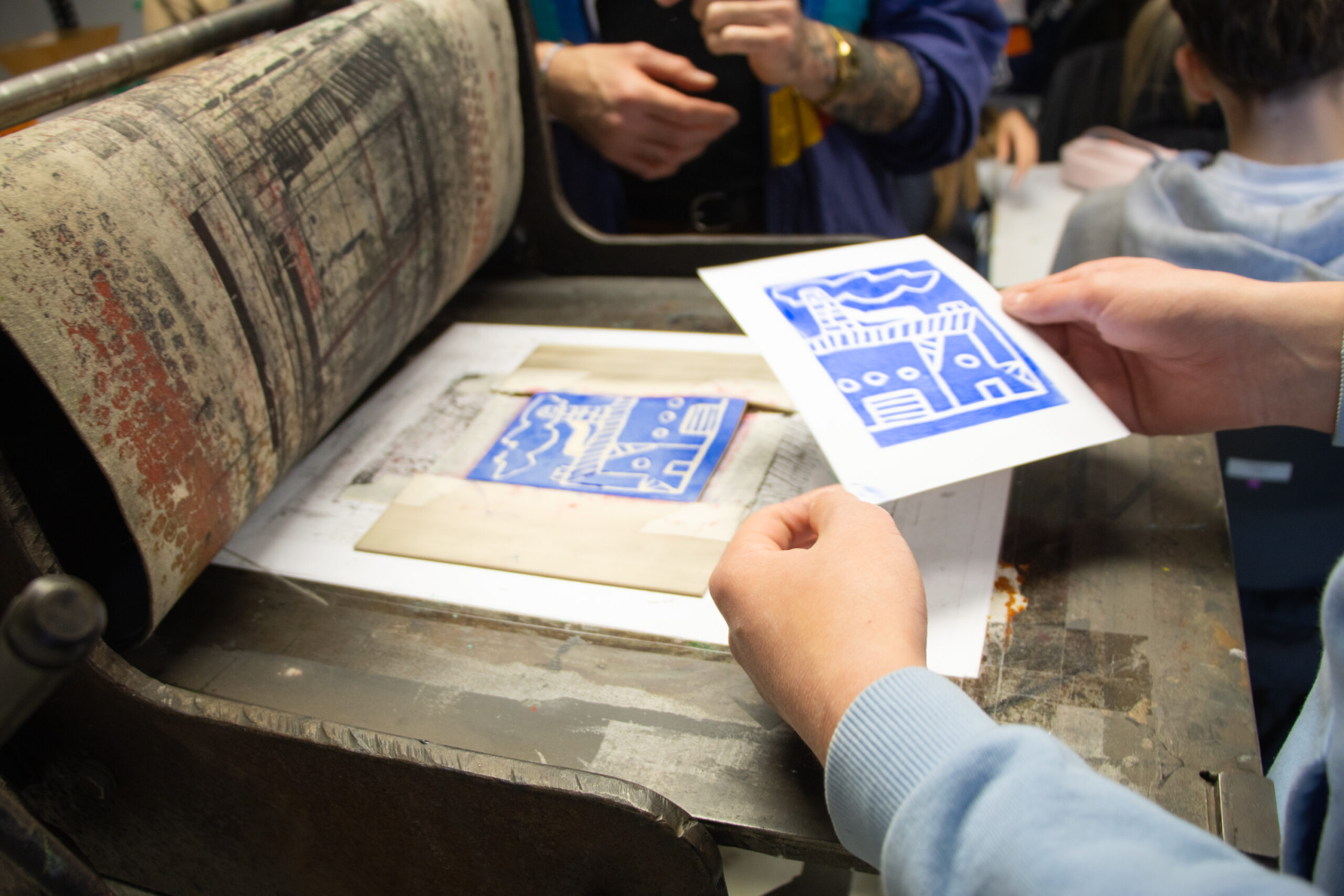 Anschließend wurden die Kinder in die Gravurtechnik eingeführt, wobei sie mit einem Hohleisen ihr eigenes Motiv kreierten. Am Ende des Workshops hängten sie ihre Plakate nebeneinander auf und schufen so eine farbenfrohe und lebendige Wand, die ihre gemeinsame Begeisterung widerspiegelte. Bevor sie sich auf den Weg machten, nahm jeder seinen Tampon und sein Poster mit, als greifbare Erinnerungen an einen Moment des Austauschs und der Entdeckung.
