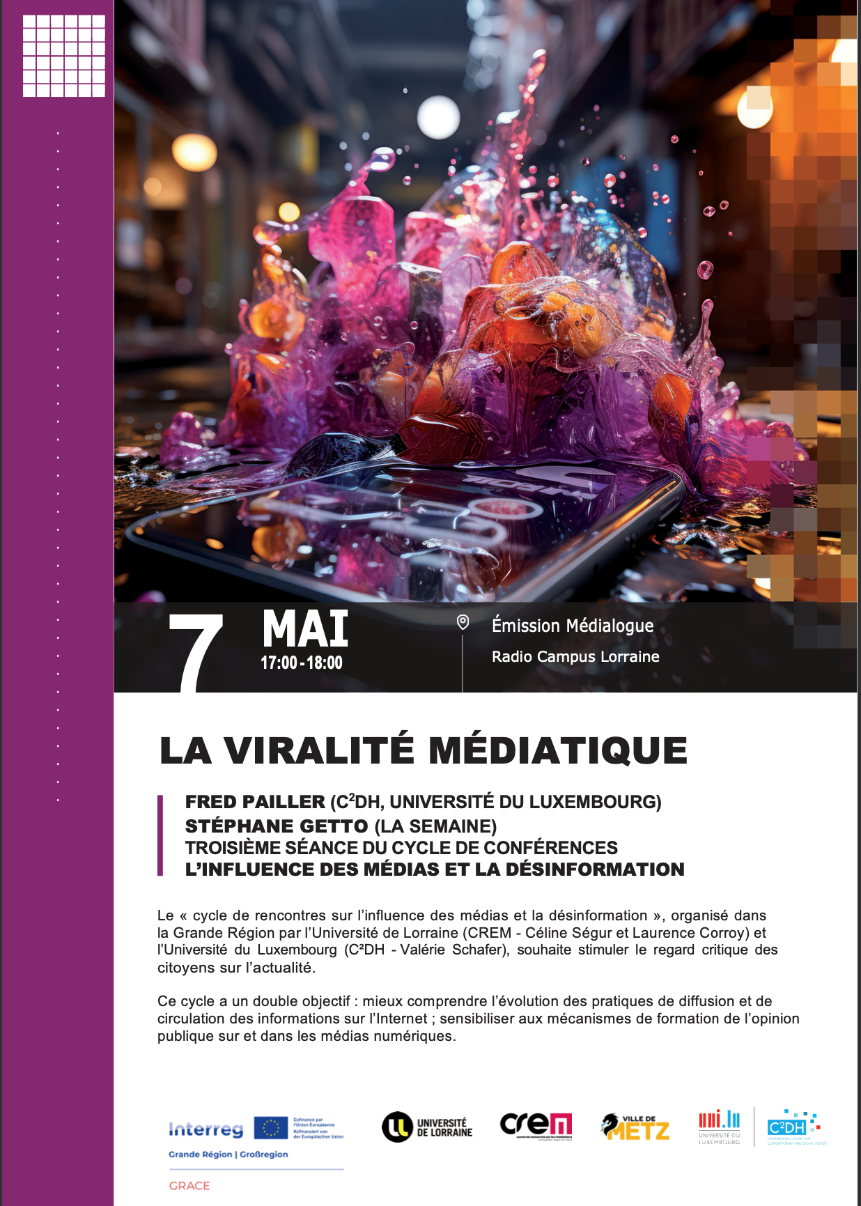 L’influence des médias et la désinformation sont parmi les questions vives de nos sociétés contemporaines. Les reconfigurations des espaces médiatiques, notamment en ligne, conduisent à de nouvelles offres et de nouveaux usages de l’information. Le « cycle de rencontres sur l’influence des médias et la désinformation » organisé dans la Grande Région est une action culturelle qui souhaite stimuler le regard critique des citoyens sur l’actualité.Entre 2024 et 2026, l’Université de Lorraine (CREM – Céline Ségur et Laurence Corroy) et l’Université du Luxembourg (C²DH – Valérie Schafer) proposent 6 conférences dans la Grande Région avec un.e chercheur.e en SHS et un.e journaliste. Chaque conférence traite sous un angle différent de l’influence des médias.Le cycle « L’influence des médias et la désinformation » a un double objectif :